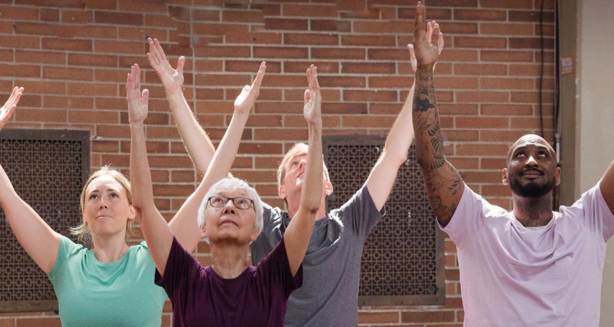 yogis with arms in the air