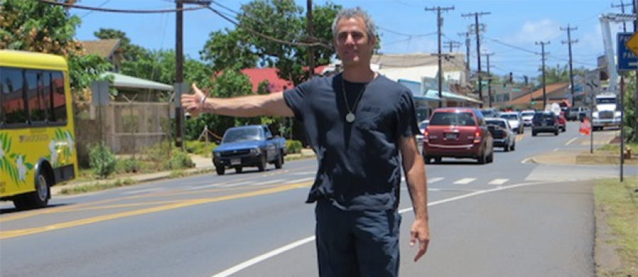 I put my thumb out and a few cars roll by without stopping. The fifth car stops. It's a woman in her 60s, browned from years in the Hawaiian sun, a lived-in face and body, hair kind of tattered. She has a dog—Sheba—in the back of the car, who is barking, not sure how she feels about me. I get in the front seat, consciously thinking about gratitude and love, and Sheba decides it's okay to have me there.