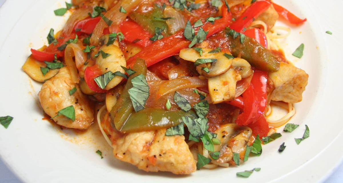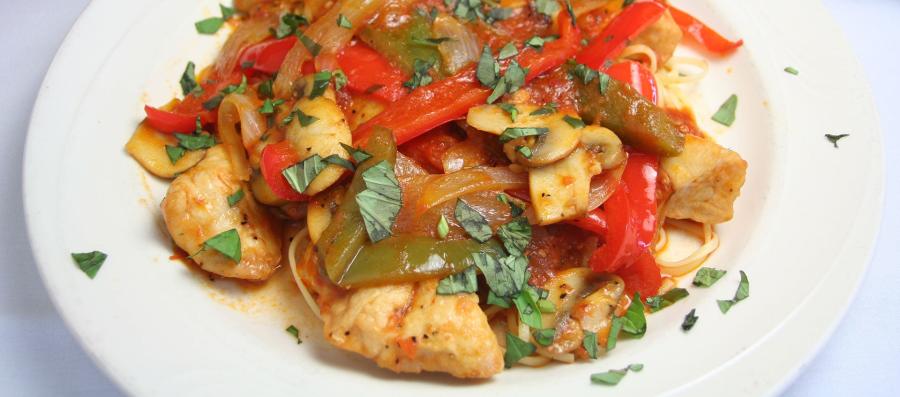 Add the onions, peppers, mushrooms, and garlic to same pan and sauté until slightly browned.