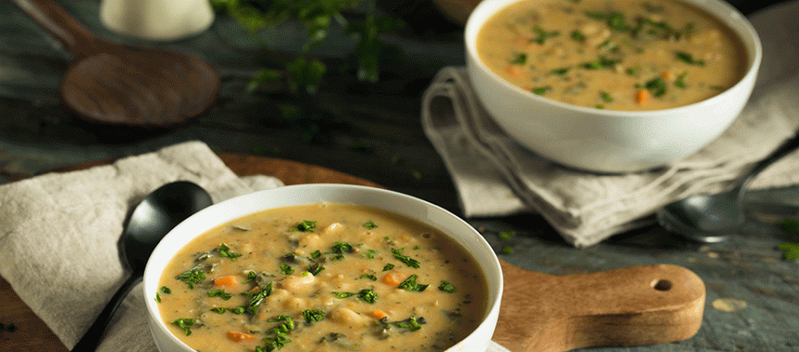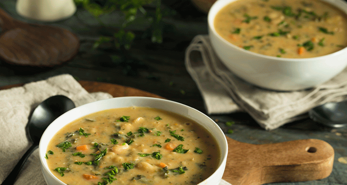 In a heavy-bottomed soup pot, saute onions, garlic, and carrots in the olive oil for five minutes. Add the herbs, salt, and pepper, and cook for a few more minutes. Add the vegetable stock and beans. Bring to a boil and simmer for 20 minutes on medium heat. Add the kale, simmer another minute, and serve.