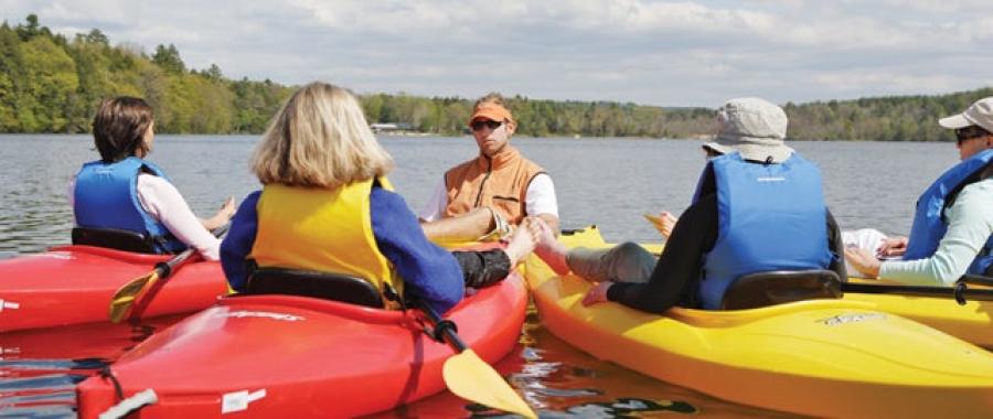 In kayaking programs at Kripalu, participants often practice a “floating meditation.” As the sun begins to rise over the Berkshires, the group rows together toward the center of Lake Mahkeenac, its surface shrouded in early-morning mist. Then they pull in their paddles, close their eyes, and let themselves float wherever the current and breeze carry them.