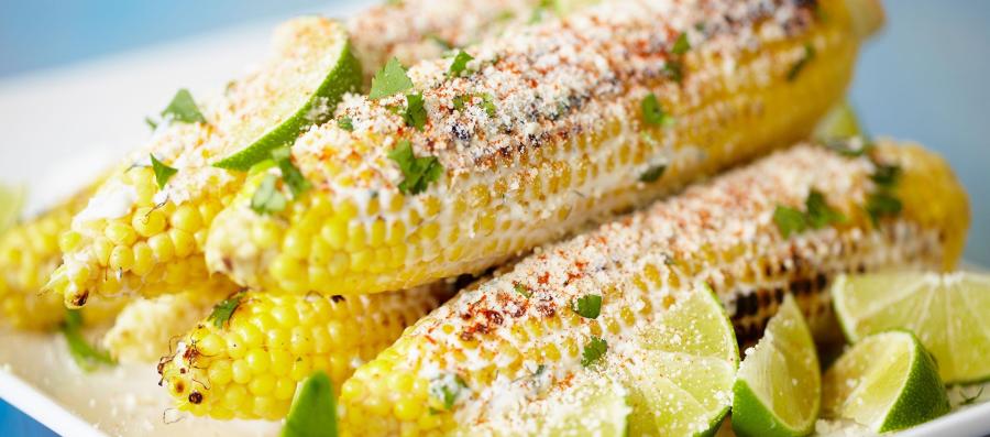 - Street corn (elote)—corn on the cob rolled in lime, spices, and cheese