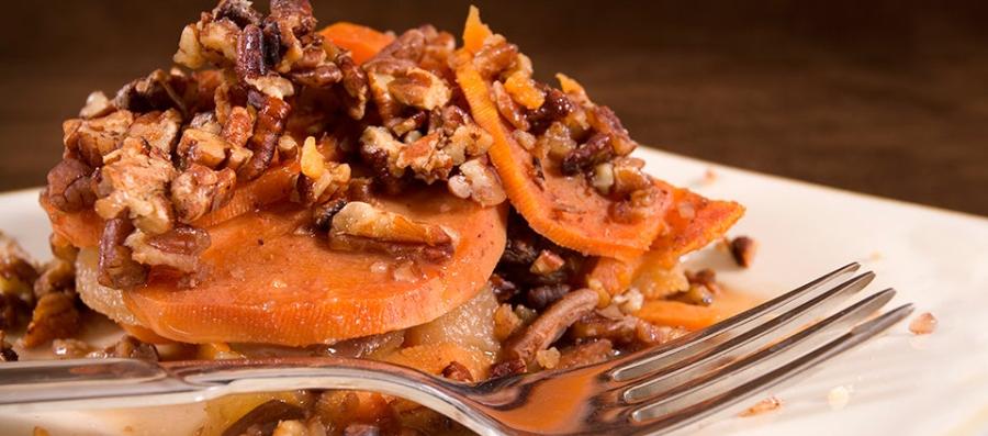 Mix sugar, pecan pieces, cayenne pepper, and cardamom in a small sauté pan with ghee or butter. Remove potatoes from oven and drizzle butter mixture over them, dividing the ingredients evenly between the two trays. Return to oven and bake until sugar is caramelized and hard, about 10 minutes.