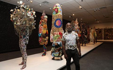 From Art21: Nick Cave is best known for his “Soundsuits”—surreally majestic objects blending fashion and sculpture—that originated as metaphorical suits of armor in response to the Rodney King beatings and have evolved into vehicles for empowerment.