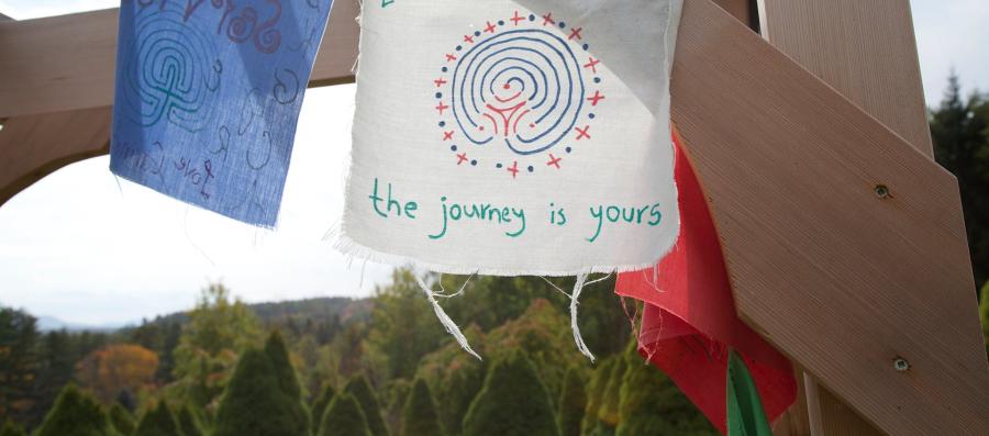 Tibetan prayer flags frame the entry to the Kripalu Labyrinth, fraying their intentions heavenward to the supreme power of choice. Blue tiles and granite cobblestones define the path punctuated by diligently pruned conifers. An errant branch juts out in defiance from an otherwise perfectly manicured hemlock.