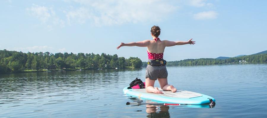 The cofounders of SUPfari Adventures in Cape Cod start their yoga retreats with a mock paddling session on the ground; students learn to navigate the equipment before making a splash is even an option. Once acclimated, the group hits the water and paddles to a protected area to form a floating yoga studio.