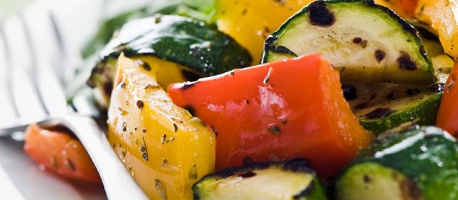 Heat grill to medium-high temperature and place veggies on grill, turning them occasionally until desired tenderness is achieved, about 12 minutes.