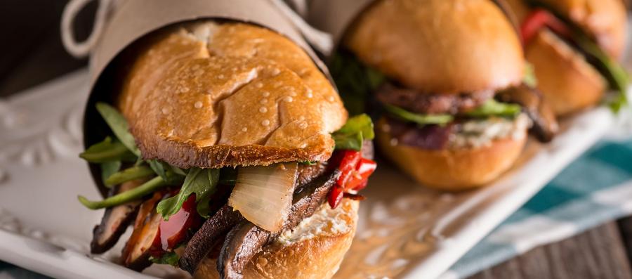 Be prepared for a big burst of juicy, satisfying, savory flavor in these sandwiches. Caramelized portobello mushrooms, dried mushroom powder, soy sauce, Worcestershire sauce, and provolone cheese are all rich sources of umami, the Japanese word for “delicious.”